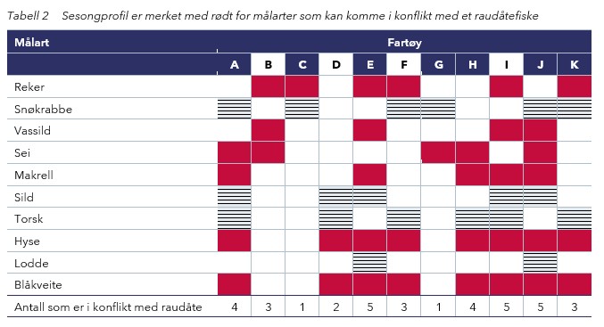I tabellen under har vi videreutviklet Tabell 2 og markert med rødt hvilke arter som har en sesongprofil som kan komme i konflikt med raudåtefisket.