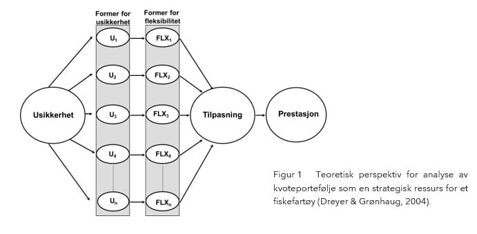 Vi har derfor i vår analyse tatt utgangspunkt i et teoretisk perspektiv som kombinerer to hovedpilarer i strategilitteratur (Dreyer, 1999; Dreyer & Grønhaug, 2004; Nilssen et al., 2014). En pilar tar utgangspunkt i at bedriftene i en bransje er eksponert mot ulike former for usikkerhet (Barney, 1991; Porter, 1985). Den andre pilaren bygger på at det fins ulike former for fleksibilitet som er egnet til å håndtere ulike former for usikkerhet, og at bedrifter i ulik grad har kontroll og tilgang til de ressursene som skal til for å utvikle de nødvendige formene for fleksibilitet som trengs (Barney, 2013; Dreyer & Grønhaug, 2004). Dette perspektivet legger vekt på at bedrifter i en bransje er forskjellige og forklarer hvordan dette er mulig. I den norske fiskeflåten er det stor variasjon i kvoteporteføljen til fartøyene. Den viktigste forklaring på dette er at fartøy har vært ulikt posisjonert ved store endringer i reguleringsregimet. Noen fartøy har for eksempel fått tildelt en fartøykvote fordi de har vært aktive før et fiskeri har blitt lukket. I andre fiskerier kan de ha blitt valgt ut blant mange søkere i en åpen konkurranse om nye tillatelser. I dag er mange kvoter på fartøy kjøpt i et marked for omsetning av kvoter. I det ressursbaserte bedriftsperspektivet kan fartøyenes kvoteporteføljer derfor være en viktig strategisk ressurs som gir fartøyene mulighet til å tilpasse seg endringer i økosystemet de skal høste fra.
