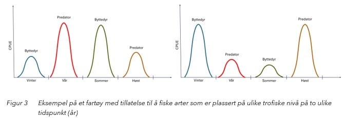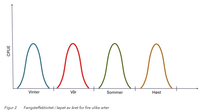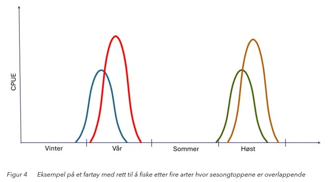 I figuren over har vi illustrert dette med et fartøy som har en kvoteportefølje med fire arter, som gir muligheten til å utnytte sin fangstkapasitet hele året og samtidig dra nytte av at alle artene fanges i perioder med høy CPUE.