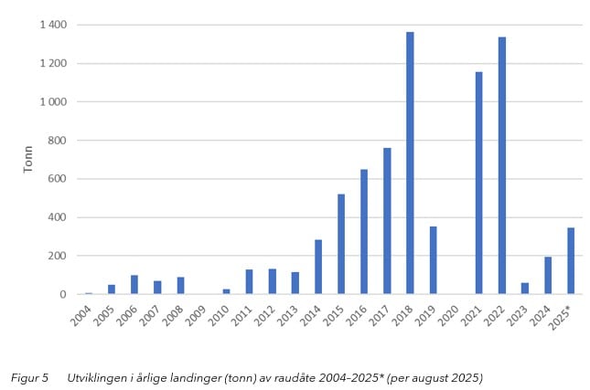 I perioden fra 2004 til 2013 var årlige landinger ofte i størrelsesorden av omtrent 100 tonn, men enkelte år ble det ikke landet eller landet svært lite raudåte. Fra 2013 til 2018 økte landingene markant, og i 2018 ble hele 1362 tonn raudåte landet. I 2019 ble det derimot landet langt mindre raudåte, mens det i 2020 ikke ble landet raudåte (Hogrenning, 2023). Både i 2021 og 2022 ble det landet over 1000 tonn. Etter dette har den årlige fangsten vært under 400 tonn. Vi ser altså at de årlige landingene ikke har vært i nærheten av 1 % av totalkvoten (se Figur 5). I hovedsak er det tre fartøy som har fisket raudåte de fire siste årene.