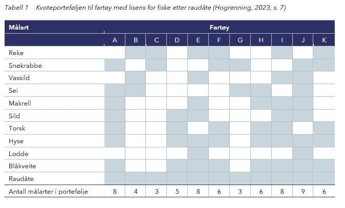 Våre funn bekrefter delvis denne hypotesen. I raudåtefisket har 2 av de mest aktive fartøyene – B og D – få alternativer. Samtidig er det 2 fartøy – F og I – som har en bred kvoteportefølje, men samtidig er aktive i raudåtefiske.
