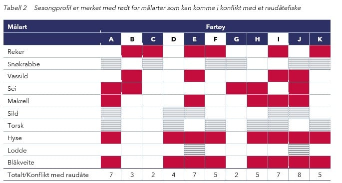 I tabellen under har vi videreutviklet Tabell 2 og markert med rødt hvilke arter som har en sesongprofil som kan komme i konflikt med raudåtefisket.